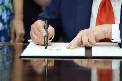 President Donald Trump speaks as he signs executive orders in the Oval Office of the White House, in Washington. Standing with the President from left are, Vice President JD Vance,…