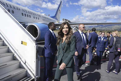 U.S. Homeland Security Secretary Kristi Noem walks to board her plane as she departs the New Mariscal Sucre International Airport, Thursday, July 31, 2025, in Quito, Ecuador. (AP Photo/Alex Brandon,…