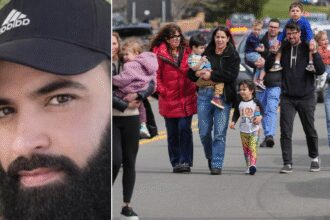 Ayman Mohamad Ghazali (Image/X@EricLDaugh) and Law enforcement escort families with children away…
