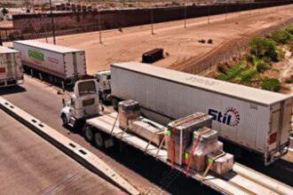 Trucks crossing into the US via a border bridge in Ciudad Juarez,…