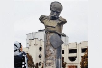 A woman in a town near Kyiv photographs Ukrainian poet Taras Shevchenko’s…