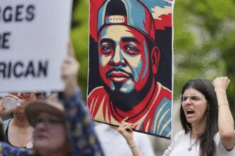 A protestor holds a portrait of Kilmar Obrego Garcia during a protest…
